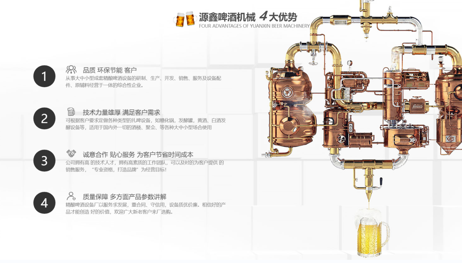 南陽市源鑫啤酒機(jī)械設(shè)備有限公司位于歷史文化名城一-南陽,從事大中小型成套啤酒、白酒自釀設(shè)備的研制、生產(chǎn)、開發(fā)、銷售、服務(wù)及設(shè)備配件、原輔料經(jīng)營于一體的綜合性企業(yè)。公司可根據(jù)客戶要求定做各種類型的扎啤設(shè)備,如糖化鍋,發(fā)酵罐,黃酒、白酒發(fā)酵設(shè)備等,適用于國內(nèi)外一切的酒樓、餐廳、家庭.聚會、酒吧等各種大、中、小型場合使用。公司擁有技術(shù)人才,擁有高素質(zhì)的工作團(tuán)隊(duì),可以及時的為客戶提供**的銷售服務(wù)。公司以“專業(yè)資格,打造品牌”為經(jīng)營目標(biāo),“卓越質(zhì)量,信賴價格”為經(jīng)營宗旨,以質(zhì)量求生存,以服務(wù)求發(fā)展,重合同、守信用,設(shè)備質(zhì)優(yōu)價廉。相信好的產(chǎn)品才能創(chuàng)造 好的價值,歡迎廣大新老客戶來廠選購。...